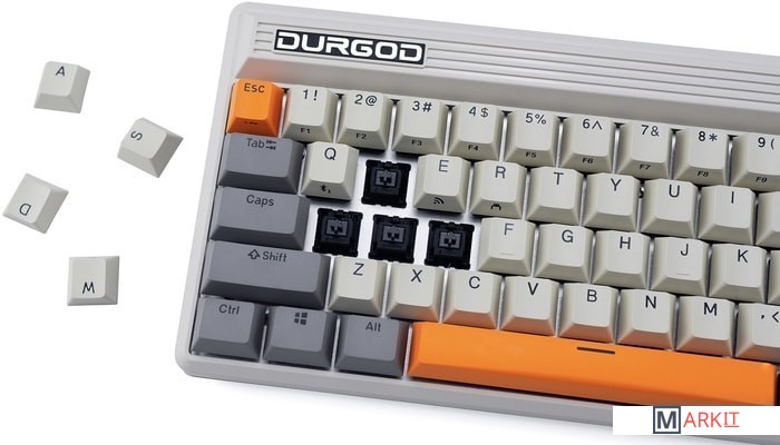 КЛАВИАТУРА БЕЗ КИРИЛЛИЦЫТип: тактильный Сила нажатия: 55 грамм (средние)Длина пути: 4 мм (2 мм до срабатывания)Помимо подключения через стандартный кабель USB клавиатура может работать в одном из двух беспроводных режимов — Bluetooth 5.0 или беспроводном соединении 2.4G, обладающем меньшей, по сравнению с Bluetooth, задержкой. Переключение между режимами осуществляется с помощью специального слайдера в верхней правой части. Благодаря беспроводному подключению вы также можете подключить клавиатуру к устройствам на iOS или Android.Два кабеля в комплекте - Вы можете использовать как USB Type-C, так и старый добрый USB Type-A.Мультимедиа и дополнительные FN функции - Клавиатура поддерживает сочетания клавиш для регулировки громкости и управления музыкой. Также имеется возможность отключить кнопку Windows.Durgod Zeus Engine позволяет создавать макросы. Можно создать свои мультимедиа, функциональные макросы и многое другое. ПО не поддерживается на Mac OS.Прочные регулируемые ножки позволят немного приподнять клавиатуру и изменить её угол наклона для более комфортной печати, а их прорезиненное дно не даст клавиатуре сдвинуться с места.Функция Full N-key Rollover по USB (NKRO) - Позволяет нажимать одновременно неограниченное количество клавиш. Для печати идеально подойдет как 6KRO, так и NKRO, независимо от вашей скорости. Для игр NKRO будет плюсом и неважно, нажимаете ли вы больше 6 кнопок или нет, поскольку, играя в любую игру, вы можете случайно нажать пару лишних клавиш и из-за этого клавиатура может не среагировать на нажатие, которые вы хотели совершить изначально. Осторожно, старые BIOS-ы могут не реагировать на клавиатуру из-за NKRO.