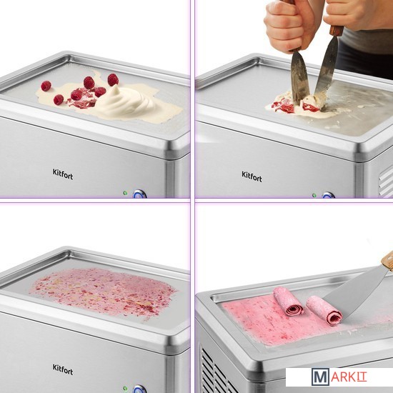 Мороженица со встроенным мощным компрессором КТ-1821 готовит «жареное» мороженое. Этот десерт получил свое название благодаря процессу приготовления, который напоминает жарку блинчика на сковородке, а сам процесс замораживания напоминает поджарку.