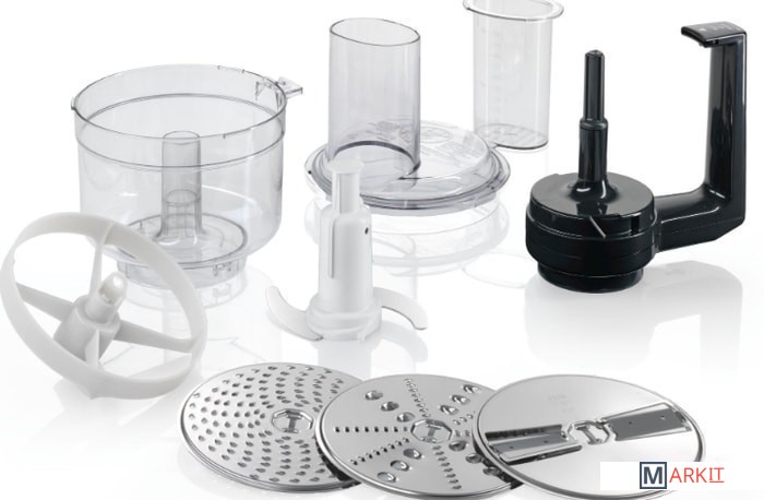 Комплектация двусторонний диск-терка (крупная/мелкая), двусторонний диск-шиновка (крупная/мелкая), терка для сыра твердых сортов, шоколада, нож-крыльчатка